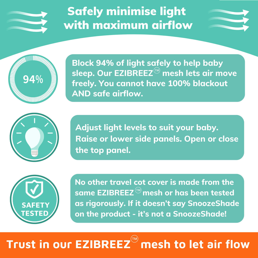 How does SnoozeShade for Portacots work? This portable blackout cot cover fits easily over standard rectangular travel cots and popular triangular travel cribs to create a safe and cosy space for your baby or toddler. Our air-permeable fabric blocks out 94% of light and blurs distractions, helping your child switch off and go to sleep in unfamiliar or bright surroundings. It's a total game-changer when staying away from home, sleeping in a room without curtains or blinds, or room-sharing with the rest of the family on holiday!