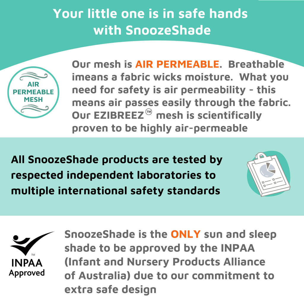 Why SnoozeShade for Portacots is safe to use: SnoozeShade was invented by Cara Sayer – a safety-obsessed mum who needed to help her daughter sleep soundly and stay protected from the sun while in her stroller. SnoozeShade Original has since become the world’s favourite sun and sleep shade for strollers, and the SnoozeShade range has expanded to include blackout shades for car seats, twin buggies, cots and portacots.