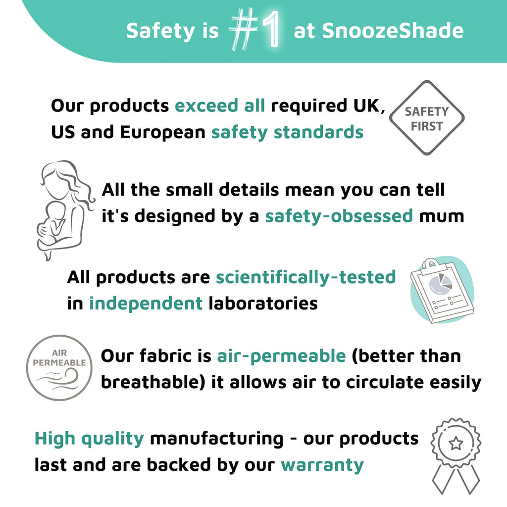 Why SnoozeShade for Cot Beds is safe to use: SnoozeShade was invented by Cara Sayer – a safety-obsessed mum who needed to help her daughter sleep soundly and stay protected from the sun while in her pushchair. SnoozeShade Original has since become the world’s favourite sun and sleep shade for pushchairs, and the SnoozeShade range has expanded to include blackout shades for car seats, twin buggies, cots and travel cots.