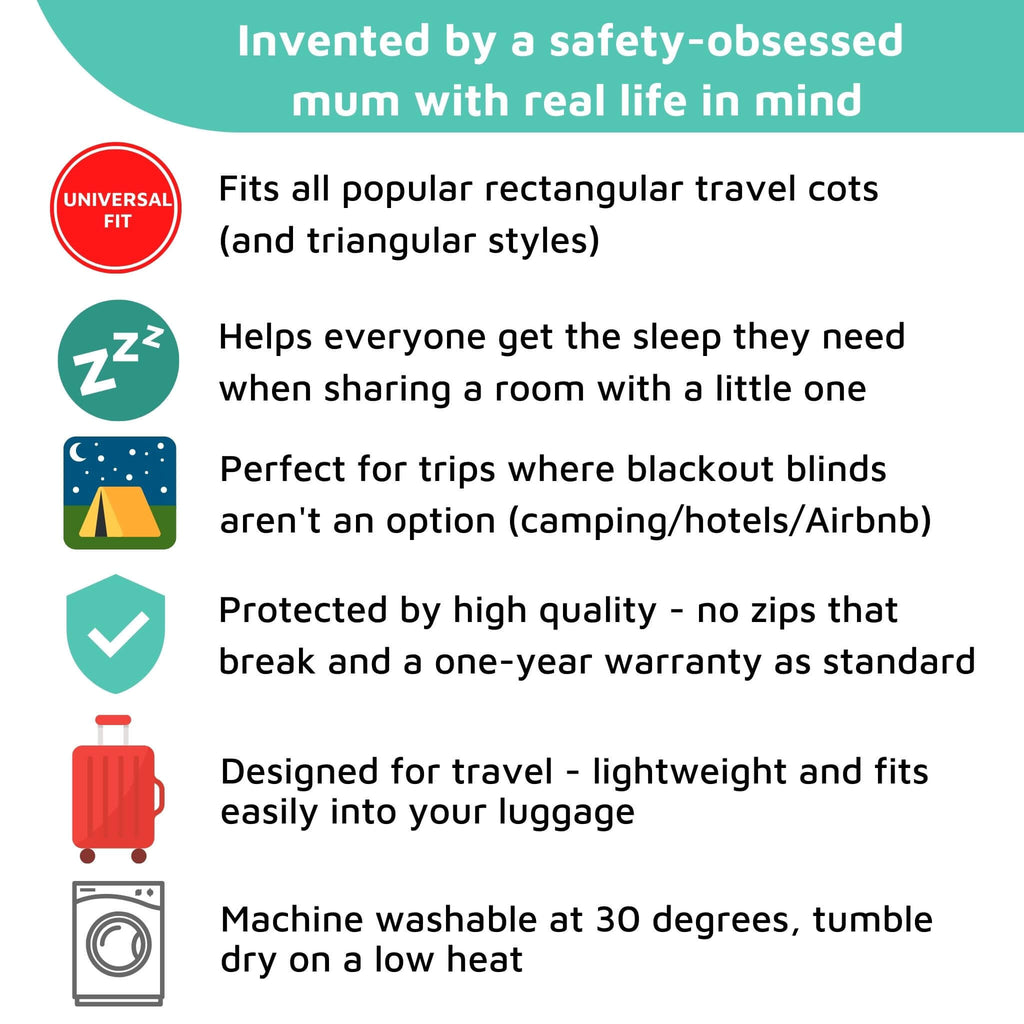 Made from air-permeable fabric that lets air flow freely, it safely blocks out 94% of light and blurs distractions, creating a cosy space for your baby or toddler and helping them switch off and go to sleep – even in unfamiliar or bright surroundings. It's a must-have accessory for staying away from home, sleeping in a room without curtains or blinds, or room-sharing with the rest of the family on holiday.